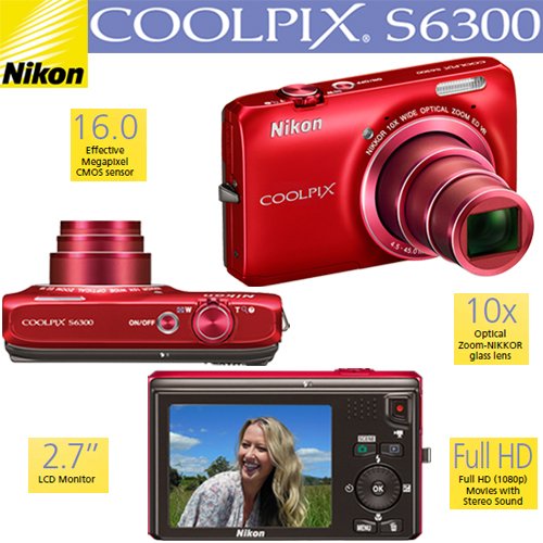 - Nikon COOLPIX S6300 16 MP Digital Camera with 10x Zoom NIKKOR Glass Lens and Full HD 1080p Video – Red (Includes manufacturer"s supplied accessories)