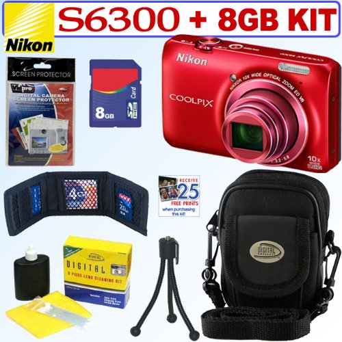 Nikon COOLPIX S6300 16 MP Digital Camera with 10x Zoom NIKKOR Glass Lens and Full HD 1080p Video – Red (Includes manufacturer"s supplied accessories) 8 Gigabyte SDHC Secure Digital Memory Card – Universal Memory Card Wallet Denali Well Padded Digital Camera Carrying Case with Pocket and Strap Lens Care & Cleaning Kit – Package of LCD Screen Protectors Flexible Legged Mini Table Tripod – BONUS!! Free 25 Quality Prints (Promo code on invoice)