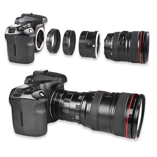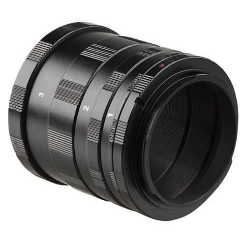 - The 3 extension tubes can be added between the camera and the lens