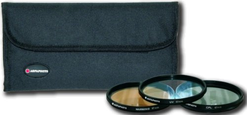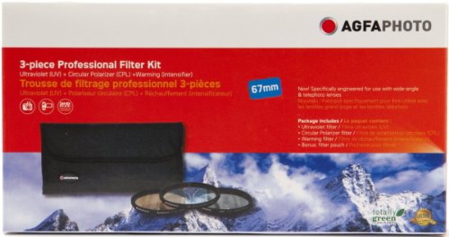 The AGFA APFTK67 is a 67mm filter kit which includes an Ultra Violet (UV), Warming and a Circular Polarizing Filter (CPL), as well as a deluxe soft filter pouch that holds up to 6 filters.