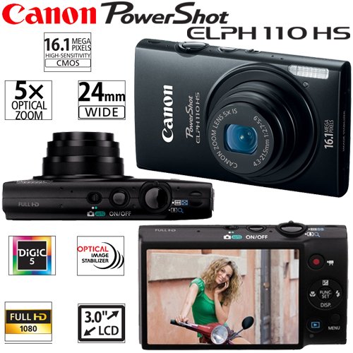 - Canon PowerShot ELPH 110 HS 16.1 MP CMOS Digital Camera with 5x Optical Image Stabilized Zoom 24mm Wide-Angle Lens and 1080p Full HD Video Recording – Black