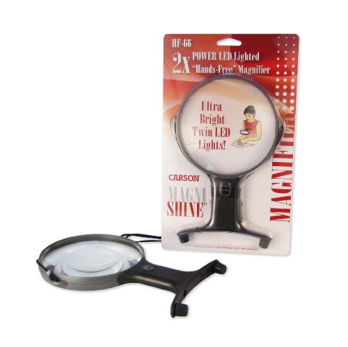 The Carson MagniShine is a 2x power Hands Free lighted Magnifier that you can be worn as a pendant magnifier around your neck. It"s built-in twin LED lights prevent eyestrain and provide bright and powerful illumination. The MagniShine magnifier has an adjustable neck cord for sewing or any activity where both hands are needed.