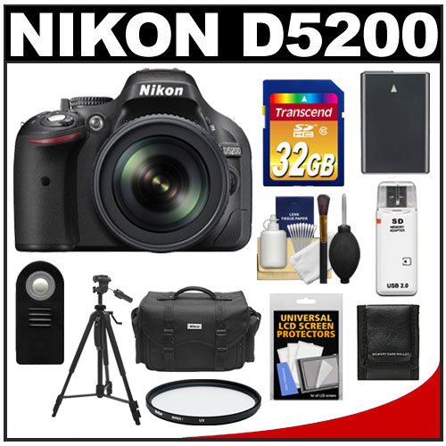 Nikon D5200 Digital SLR Camera & 18-105mm VR DX AF-S Zoom Lens (Black) with 32GB Card + Battery + Case + Filter + Remote + Tripod + Accessory Kit
