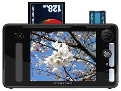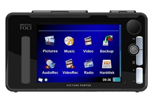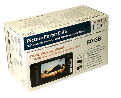 Picture Porter Elite – 3.6″ Portable Digital Photo Viewer – Store, view, and share digital photos anywhere you go. *Ultimate Digital Camera Companion: Copy photos directly from memory cards and keep snapping away. Picture Porter Elite supports all popular memory cards directly: CF, MD, MMC, SD Card, MS, MS PRO, and xD. Simply insert the memory card from your digital camera into Picture Porter Elite and download images into its built-in hard drive. *Fast copy speed – Copies 1 full 1GB CF card in under 5 minutes. Files copied from memory cards are kept in their original file name and format. *Portable Photo Album: Carry your collection of digital photos with you and view them anywhere on the bright 3.6″ color LCD screen. You can rotate, zoom, pan, view EXIF information & histogram of your images (including RAW image content). *Music and Video Player: Store and enjoy your favorite music files (MP3, WMA, AAC, WAV) and video files (MEPG1, MPEG4, WMV9, MJPEG) whenever you want. *Video recorder: Record videos from TV, VCR, digital video camera with scheduled recording function into MPEG-4 format. *PictBridge compatible: Print photos directly to any PictBridge compliant printer without a computer. *Bi-directional memory card data transfer: Copy directly from memory card to Picture Porter Elite and vice versa. **Portable Hard Drive with High-speed Computer Connection: USB 2.0 connection supports fast uploads and downloads to and from your computer. *Other features – TV output, FM radio, built-in speaker, and built-in mic for audio recording. *Long-lasting Rechargeable Battery: User-removable Lithium-Ion battery lets you enjoy up to 4 hours of continuous video and 12 hours of continuous music. Package includes Picture Porter Elite, rechargeable Li-Ion battery, AC power adapter, USB cable, video/audio cables for A/V output, Audio/video bus cable for RCA A/V input, remote control, earphones, protective carrying case, wrist strap, User"s Guide, and Quick Start Guide.
