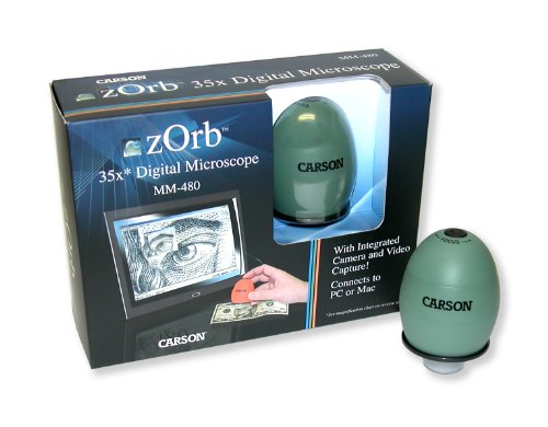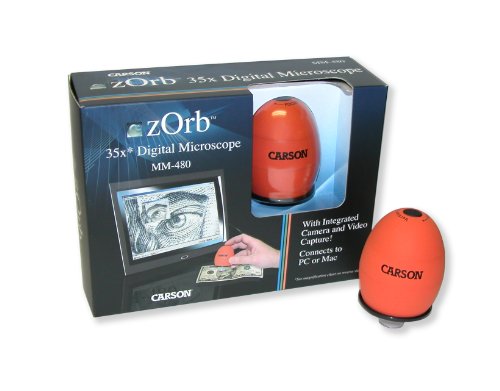 The MM-480 zOrb from Carson Optical is a Digital Microscope with an integrated camera that displays the magnified image right on your computer screen. The impressive 35x Magnification (14″ monitor) allows you to see details of ordinary objects you never knew existed! The built-in internal illuminator ensures a clear and bright image. The zOrb Digital Microscope comes in 3 colors: Surf Blue, Safari Green and Lava Orange. Capture an image to keep using the built-in 640 x 480 resolution digital camera. You can even capture close-focus video with the zOrb! The zOrb is compatible with Microsoft Windows 98SE, ME, 2000, XP, XP Service Pack 3 Upgrade, Vista and MAC OSX 10.4 or later. A USB 2.0 port is required.