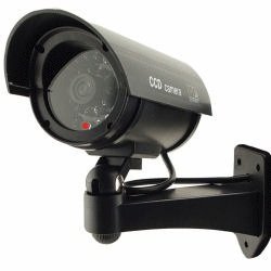 Now you can deter robbery, theft, and vandalism without the high cost of a real security camera. When placed in your home or business, even the most sophisticated criminals will think the premise is guarded by a high-tech surveillance system and go in search of an easier target. In fact, this is an actual surveillance camera that has been modified into a “dummy” or fake security camera. This unit does contain a flashing light. The camera features authentic video cable and a fully adjustable mounting bracket that will let you install the camera quickly and easily using the included stainless steel screws. Dimensions of the camera are 5 one half inches x 3 inches x 2 and one half inches (without rain shield). With the rain shield the dimensions increase to 7 x 3 x 3 inches. The camera requires 2 AA batteries that are not included.
