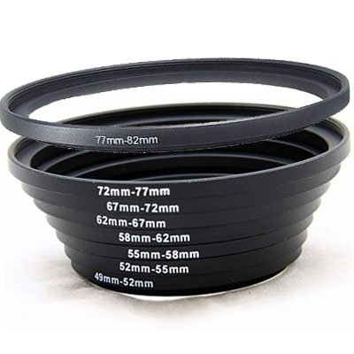 Package Included: 49mm-52mm Step-up ring x1, 52mm-55mm Step-up ring x1, 55mm-58mm Step-up ring x1, 58MM-62mm Step-up ring x1, 62mm-67mm Step-up ring x1, 67mm-72mm Step-up ring x1, 72mm-77mm Step-up ring x1, 77mm-82mm Step-up ring x1.
